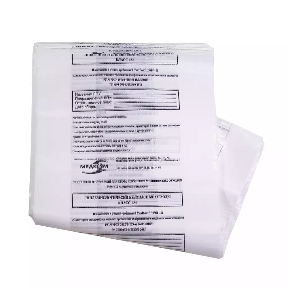 Пакет для сбора медицинских отходов, класс А (белый), размер 330х600мм, объем 10-12л, плотность 10 микронМедКом НПФ (РОССИЯ), 100 шт