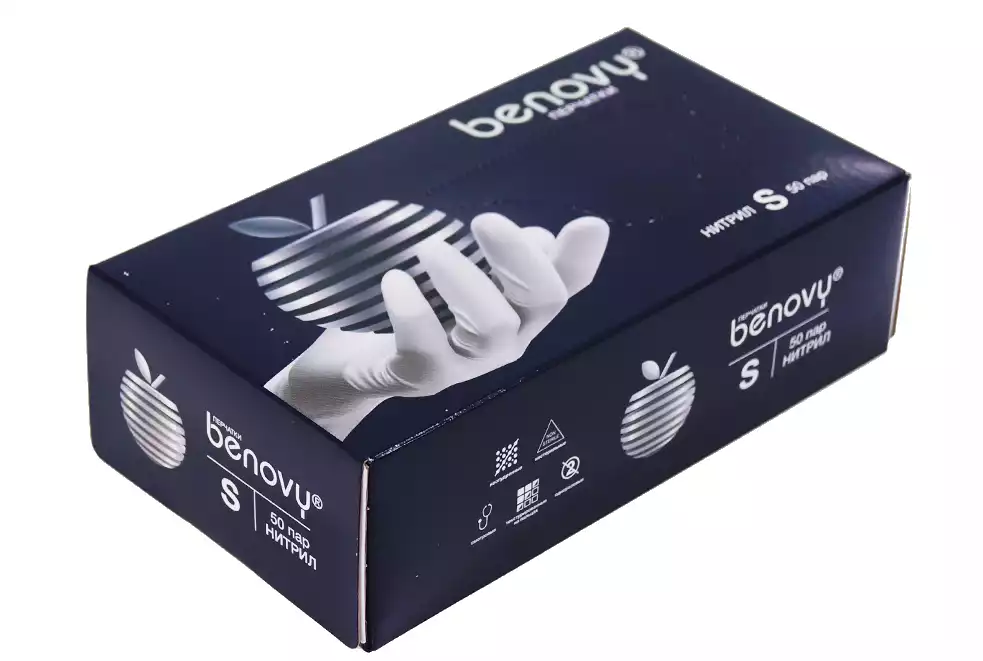 Перчатки BENOVY, размер S, нитриловые, вес 6,0г/пара, неопудренные, текстурированные на пальцах, цвет белый, нестерильные, 50 пар, TG Medical Sdn.Bhd. (КИТАЙ)