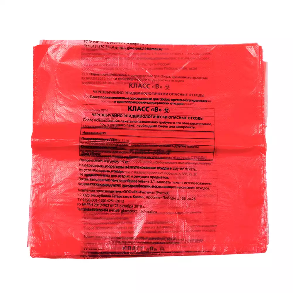 Пакеты изготавливаются из высокопрочного двуслойного полиэтилена с повышенной устойчивостью к проколам и разрывам, что гарантирует надежную изоляцию медицинских отходов и предотвращает их контакт с внешней средой. Дно пакетов выполняется по бесшовной технологии с двойной спайкой для обеспечения максимальной герметичности. Производители придерживаются ряда нормативов: