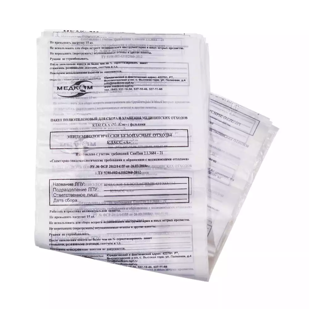 Каждый пакет оснащается специальным информационным окном для четкой идентификации и маркировки конкретного типа содержащихся в нем отходов, что дополнительно повышает безопасность обращения с ними.