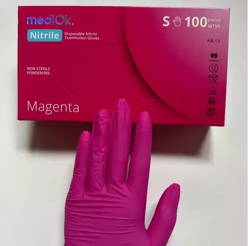 Перчатки mediOk Nitryl Magenta, размер S, нитриловые, вес 7,0 г/пара, неопудренные, текстурированные на пальцах, нестерильные, цвет розовый,упаковка 50 пар, MediOK (МАЛАЙЗИЯ)