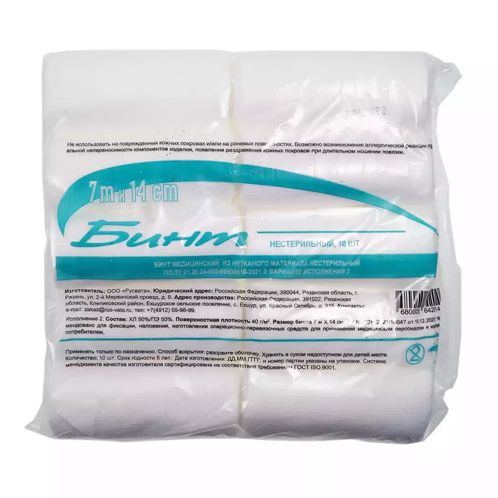 Бинт нетканный, размер 7м*14см (полиэфир 50% + хлопок 50%) нестерильный, групповая упаковка, РусВата (РОССИЯ), 10 шт