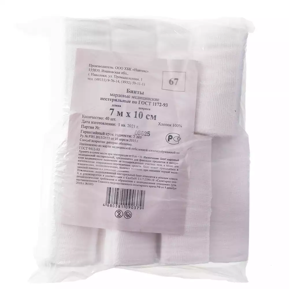 Бинт марлевый, 7м*10см, плотность 36г/м2, нестерильный, Навтекс ХБК (РОССИЯ), 40 шт