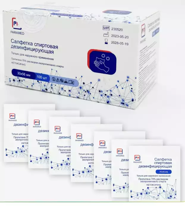 Салфетка спиртовая антисептическая для инъекций размер 30*56 мм, (70% изопропиловый спирт)Ningbo Greetmed Medical Instruments Co Ltd (КИТАЙ), 100 шт