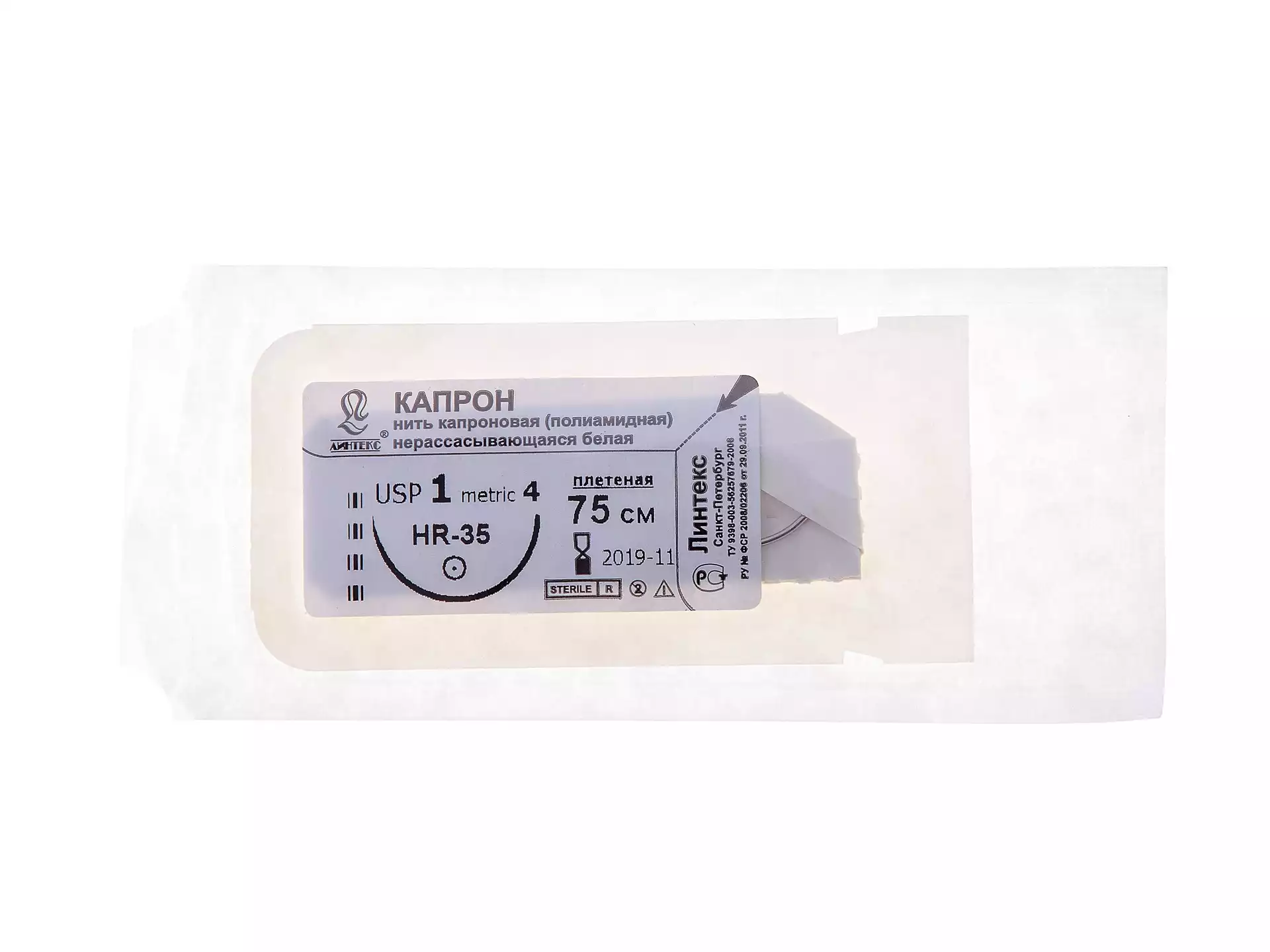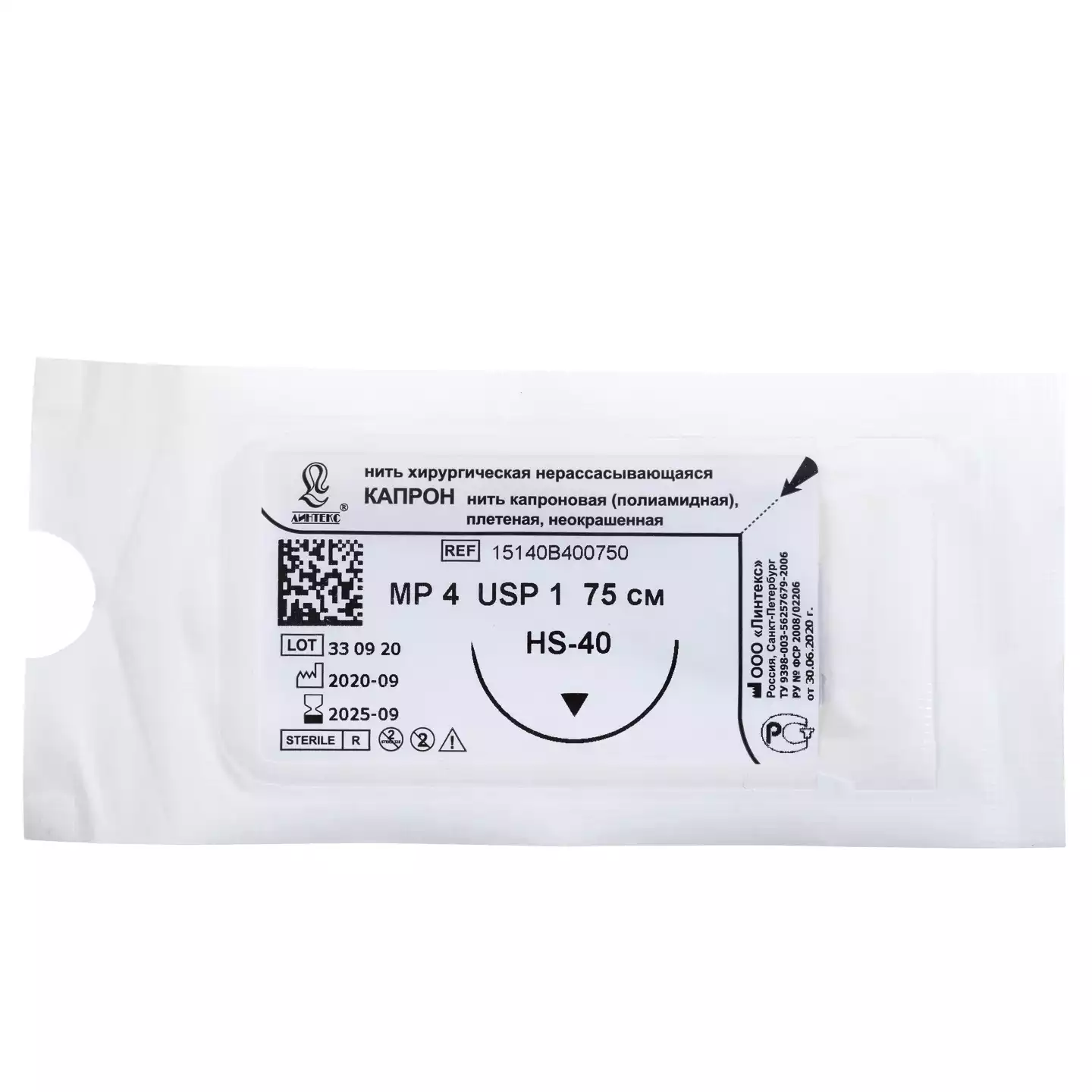 Капрон плетеный 1 (MP4) длина нити 75см, игла HS-40, белый, Линтекс (РОССИЯ)