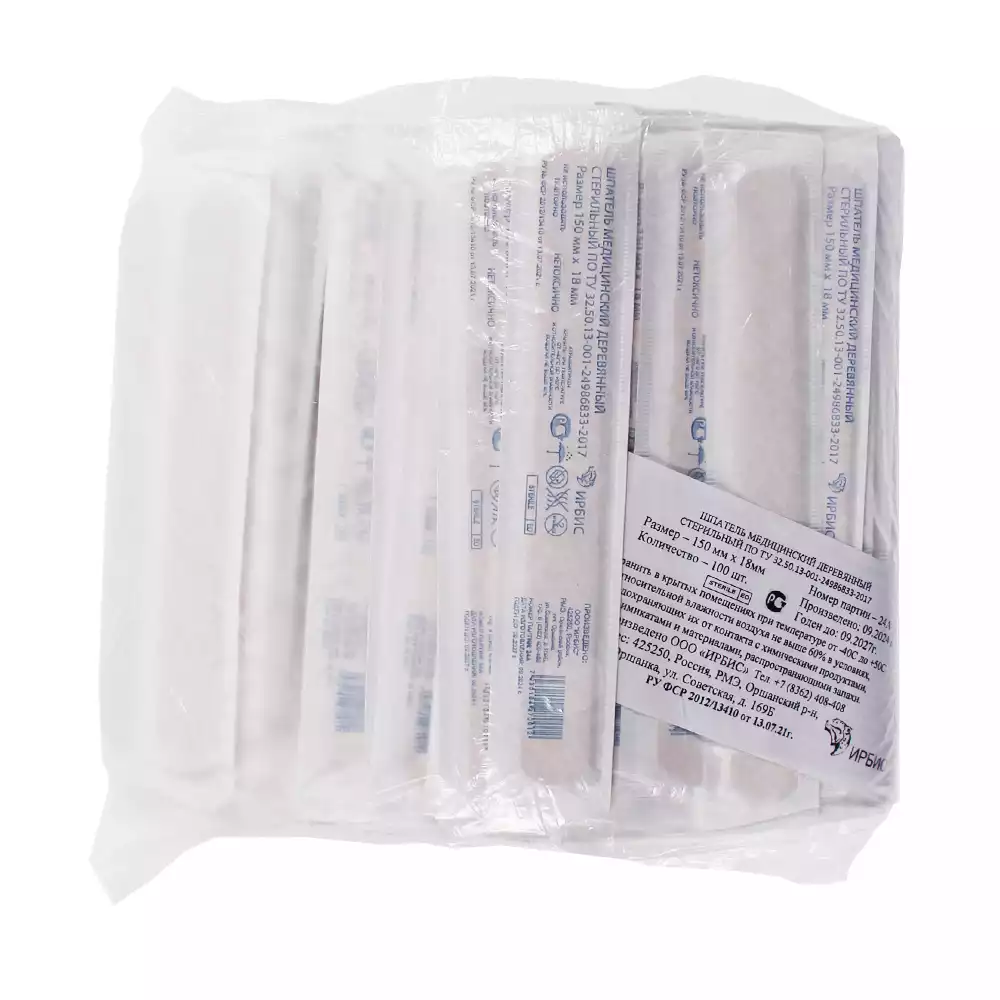 Медицинский шпатель из дерева, предназначенный для однократного использования, поставляется в стерильной упаковке. Каждая единица имеет размеры 150 на 18 миллиметров при толщине 1,8 мм. Комплект включает 100 штук, упакованных в картонную коробку.