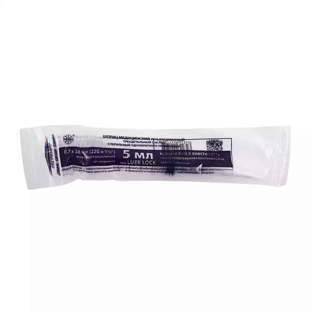 Шприц LEIKO 5,0мл, 3-х компонентный, игла 22G*1 1/2 (0,7*38мм), соединение Луер Лок, стерильный